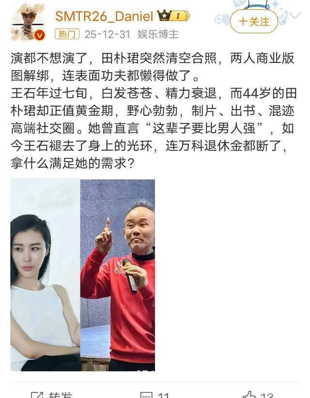 就在田朴珺的大型跨界访谈节目《共同说》,王石、段永平、田朴珺难得同框里,田朴珺在荧幕里谈笑风生,仿佛一切都在掌握之中,而王石更像是被时代抛弃的人,自带落寞。 特别是节目收尾时段永平对王石说的那一句“对自己好一点”,又何尝不是戳破了王石婚姻中最后滋崩的遮羞布。 就在最近,网传田朴珺删了很多与王石的同框合照,婚变传闻瞬间挂上热搜。